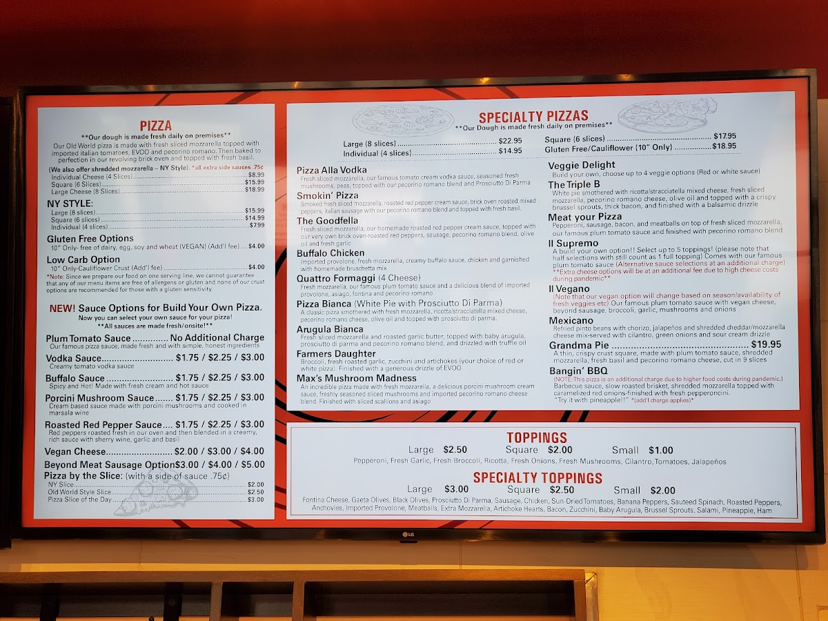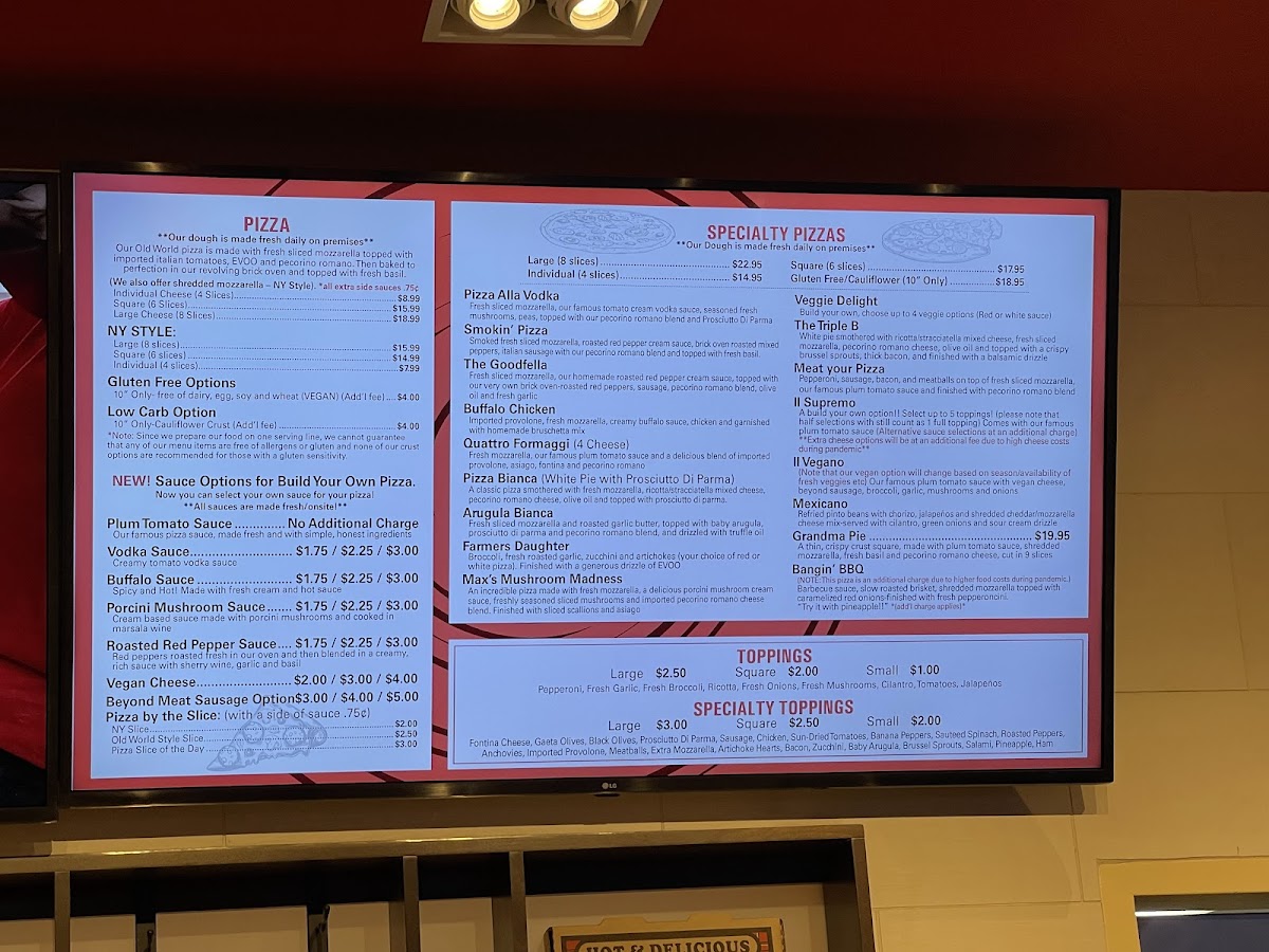 Our famous plum tomato sauce with vegan cheese, Beyond Sausage, broccoli, garlic, mushrooms and onions. Note that our vegan option will change based on season/availability of fresh veggies etc.